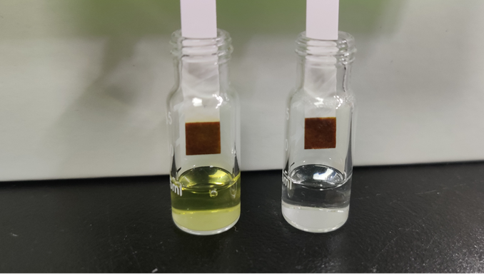 改造后用于制备葡萄糖的酵母菌株发酵液(棕色溶液),及制备的葡萄糖(白色溶液)