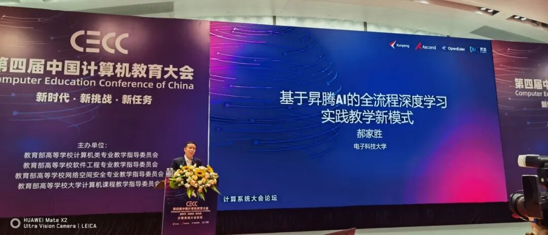 我校自动化工程学院教师郝家胜副教授还受邀参加计算系统大会论坛,以首位报告嘉宾,做主题为“基于昇腾AI的全流程深度学习实践教学新模式”的演讲。他介绍了自主研制的远程推理集群实验教学平台的创新特性,并结合“智能基座”合作课程的实际教学情况,分享了从模型训练、模型推理到创新应用的全流程AI实践教学新模式、学生的实践成果和正向评价。