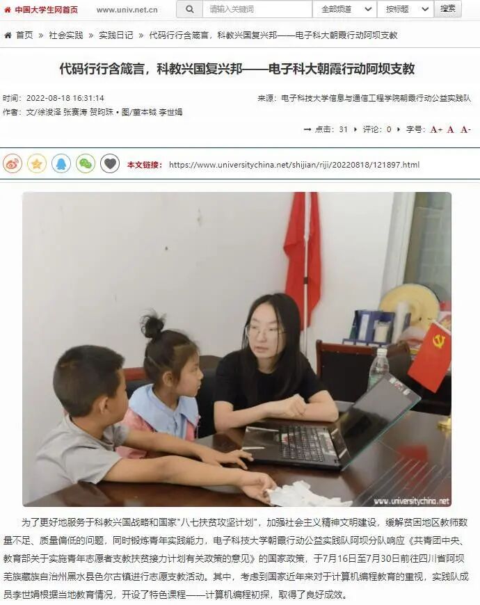 在黑水县人民政府的支持下,张赛涛带领的支教队结合我校电子信息的专业特色,开设了“计算机编程初探”、“数字王国大冒险”等特色课程。此外,张赛涛还带领队员对色尔古镇的非物质文化遗产——藏笛进行了实地调研,为县政府撰写了文化产业发展报告,希望能够以实际行动助力地方文化产业的发展与传承。