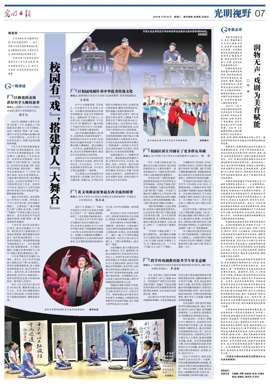 学校每年举办校园川剧文化艺术节,开办讲座、沙龙、快闪、川剧服饰体验、川剧演出等系列活动,把整个校园都打造成川剧的舞台。在完成妆容装扮后,不少学生对着镜子惊呼:原来自己也可以成为一名川剧的“角儿”。很多人因此加入川剧社团,成为川剧文化的忠实粉丝。
