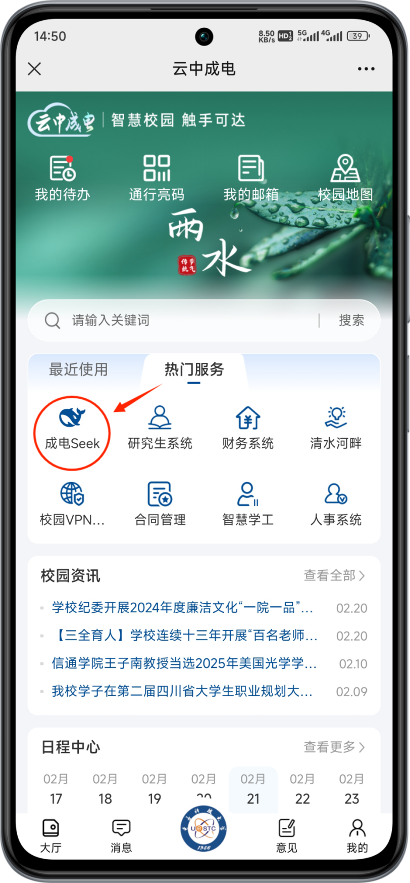 “云中成电”的首页“热门服务”,找到“成电Seek”