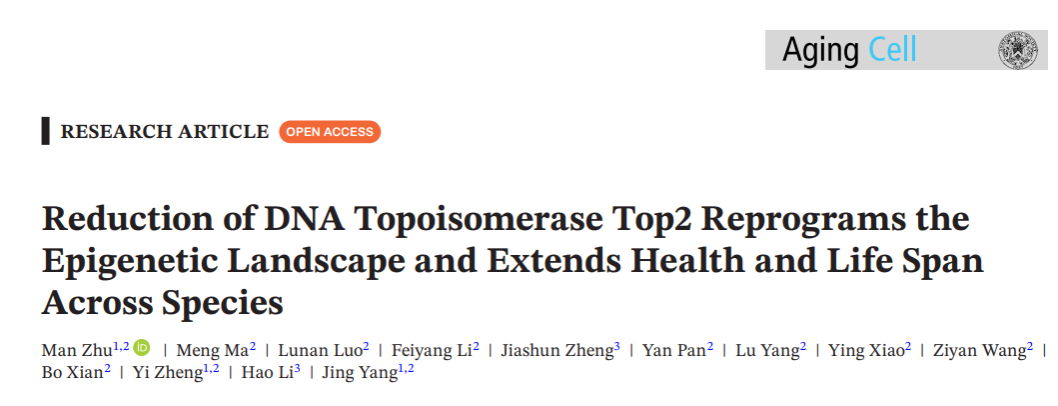 近日,医学院衰老研究团队在重要学术期刊 Aging Cell 在线发表了最新研究进展 Reduction of DNA Topoisomerase Top2 Reprograms the Epigenetic Landscape and Extends Health and Life Span Across Species 的研究论文。重要的干预靶标的研究对于抗衰老策略开发具有重要意义,既往传统的高通量寿命筛选研究挑选出的延寿基因多为非必需基因,而人们对必需基因给寿命带来的影响知之甚少。本项研究工作发现,降低必需基因拓扑异构酶Ⅱ的表达可在多种模式生物中延缓衰老,可能是一个全新的衰老干预靶标。