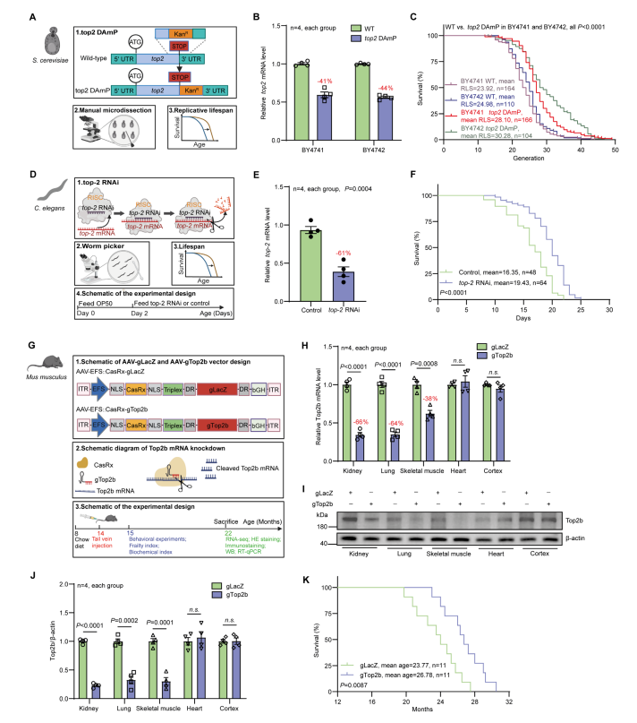 图1 Top2及其同源基因TOP2B表达下调对多种模式生物寿命均表现出延寿效应