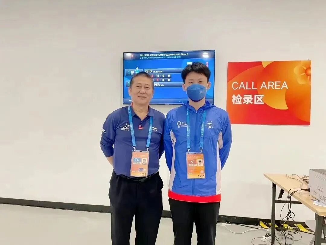 2022年第56届国际乒联世界乒乓球团体锦标赛(决赛)上与彭华裁判长助理的合影
