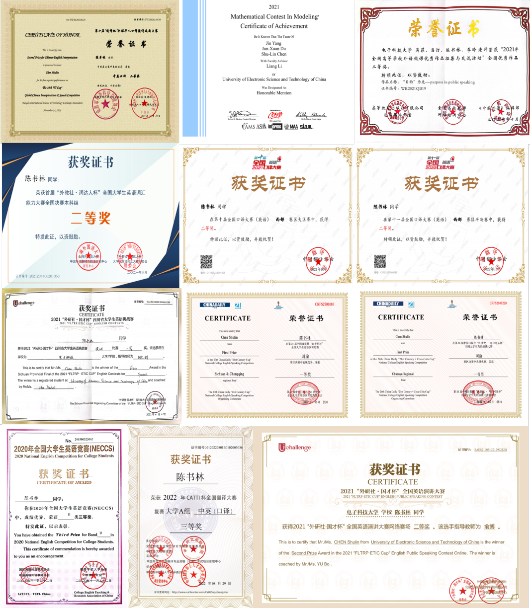陈书林,中共党员,外国语学院翻译专业2019级本科生,2022年度成电杰出学生,中国翻译协会会员。在校期间,连续三年专业第一,三次获国家奖学金、校优秀学生一等奖学金。雅思首考8.0,持CATTI三级笔译、三级口译,UNLPP笔译P2、口译P1等6项翻译水平证书。获“外研社杯”全国英语演讲大赛四川省一等奖、“21世纪杯”全国英语演讲大赛川渝赛区一等奖、美国大学生数学建模竞赛Honorable Mention、“通译杯”全球华人口译大赛二等奖、全国口译大赛西部赛区二等奖等15项省级及以上竞赛奖项。历任院学生会主席(校十佳学生会)、行政班班长(校优秀班级)、校立人班导生(校十佳立人班)、格拉斯哥学院翻译工作室负责人等10项学生工作职务,双语主持第十七届中国模拟联合国大会开闭幕式、成电讲坛等15场重大活动。获四川省优秀毕业生、四川省大学生综合素质A级证书、成都市公共英文标识纠错之星、校十佳团员优秀团干等25项个人荣誉。推免至南京大学-约翰斯•霍普金斯大学中美文化研究中心国际关系专业深造。