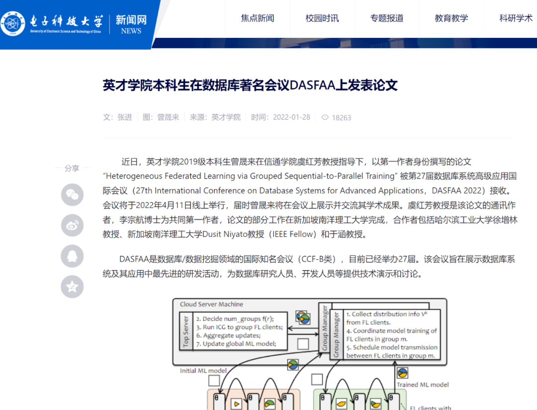 曾晟来,英才实验学院2019级本科生,2022年度成电杰出学生。曾获国家奖学金、WAC华格奖学金、英才最具领导力奖等荣誉;担任电子科大校学生会驻会主席、英才学院学生会主席、行政班班长。以第一作者身份在数据库顶会DASFAA发表论文一篇(口头报告),第一作者完成一篇云计算顶级期刊IEEE Transaction on Cloud Computing文章,共同第一作者在数据挖掘顶会SDM发表论文一篇。申请一项国家发明专利,参与人工智能前沿理论技术与应用丛书的编著,参与一项国家重点研发计划项目,一项国家自然基金项目。相关成果支持建设鹏城实验室多云计算融合大科学装置,入选中国通讯学会2021未来网络领先创新科技成果。入选国家留基委全额赞助的Mitacs加拿大全奖暑期科研项目并得到英属哥伦比亚大学暑研offer。目前已经收获香港中文大学、香港科技大学、南洋理工大学等校全奖直博offer。