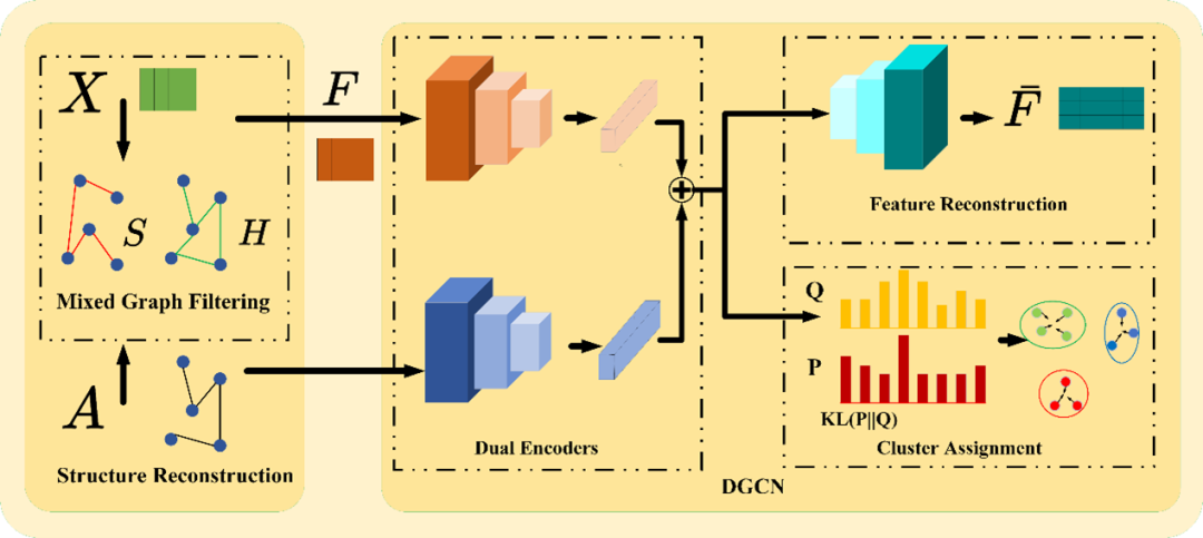 该篇论文是潘尔林同学继NeurIPS后的又一重要工作,文中提出使用重新构图和混合滤波来解决图(特别是异质图)的无监督聚类问题。当前对异质图上的研究工作都是针对半监督、监督任务,首先根据标签信息把图数据分为同质图和异质图,然后设计不同的模型来分别处理。该工作是对异质图无监督任务的首次探索。尤其是,在无监督场景下,图的同质/异质性无从得知,这个工作也为各种类型的图结构数据提供了一个通用的处理框架。该方法有三个重要模块:1)图重构模块:对图数据重新构造同质、异质两个拓扑结构,特别是同质拓扑的构造中,首次使用二阶拓扑趋近于一阶拓扑的思想来提高结构的同质度;2)混合滤波器:基于构造的图,使用混合滤波来融合图数据的拓扑和节点特征,充分利用数据高频、低频的信息;3)双生图聚类网络:将滤波后的特征和原始拓扑信息在不同子空间中学习嵌入,减少了信息冲突。该工作在图聚类,特别是异质图聚类中有巨大优势。其中,重新构造图结构的方法十分新颖,在其他图学习等任务中具有巨大的应用潜力。