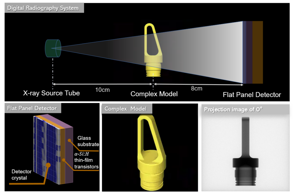 图二 Geant4平台上数字X射线成像系统的三种组成部分与0°投影图片