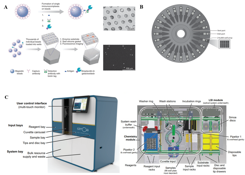 在继发性临床症状和体征出现之前,通过测量异常生物标志物水平来识别新的疾病过程,对于诊断和治疗干预至关重要。早期疾病诊断的主要因素是蛋白质和核酸。然而,传统的免疫测定方法存在一些局限性,比如缺乏灵敏度、需要复杂的操作步骤和昂贵的仪器,导致检测效率低、成本高。与传统方法相比,单分子免疫测定技术检测灵敏度可提高2-3个数量级,还具有成本低、速度快的优点。