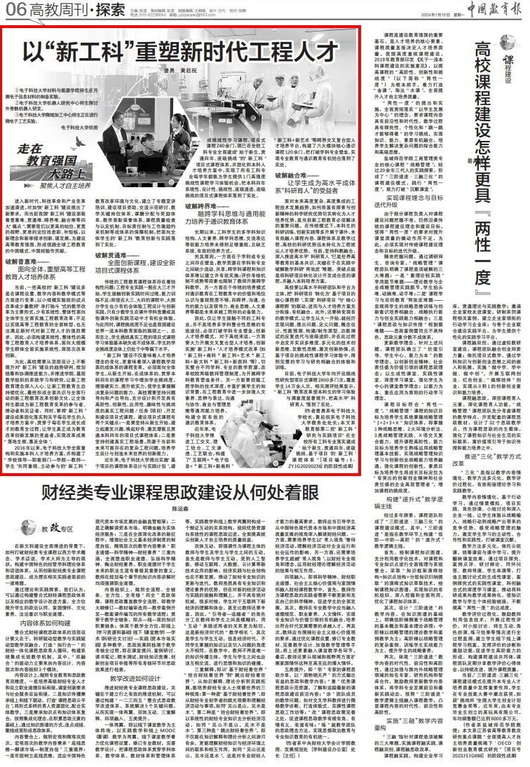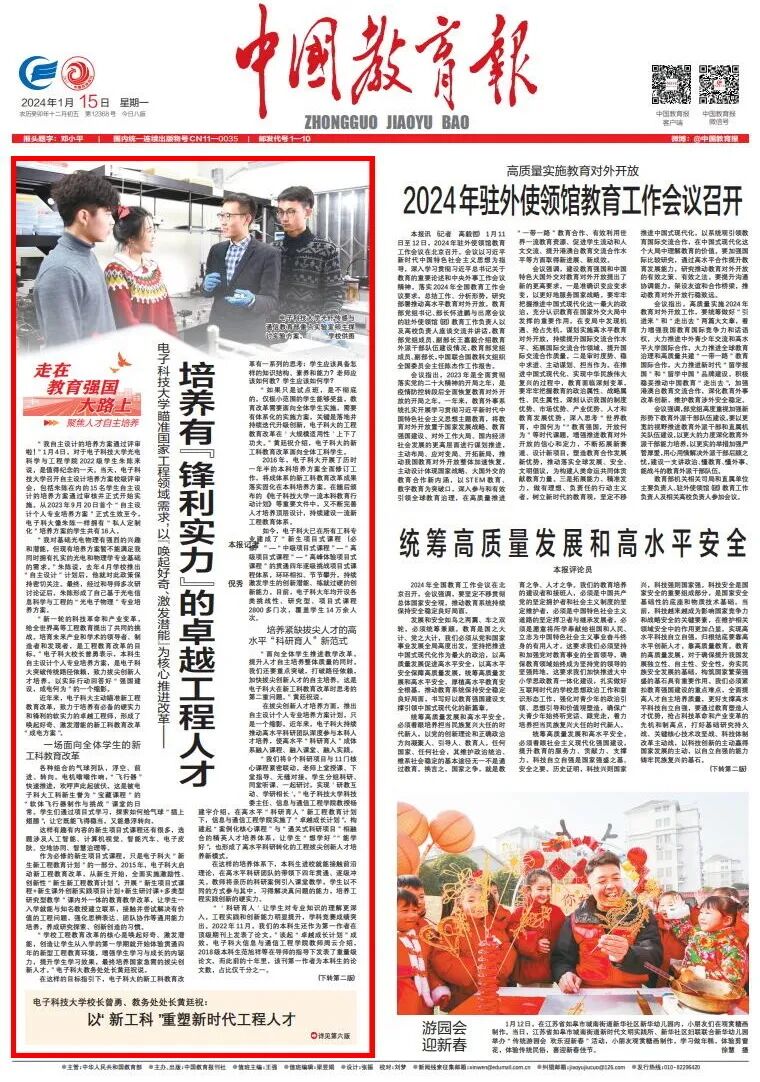 1月15日,《中国教育报》头版头条刊发了《培养有“锋利实力”的卓越工程人才》通讯报道,聚焦于当前必威官方客服开展的新工科教育改革。第六版头条刊发了必威官方客服校长曾勇,国家级教学名师、教务处处长黄廷祝的署名文章《以“新工科”重塑新时代工程人才》。本文对“新工科”建设存在的难点做了简要分析,介绍了学校取得的阶段性成果。