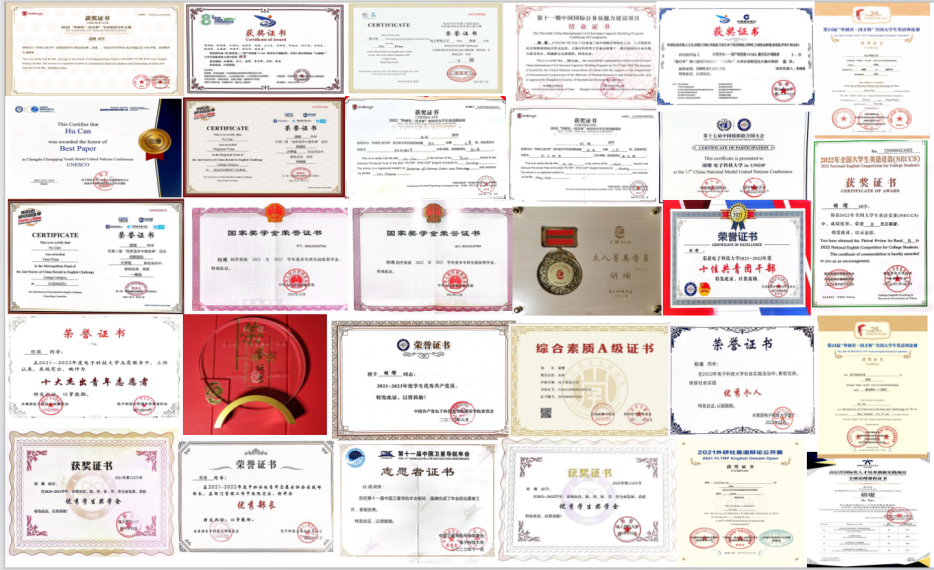 胡璨,中共党员,外国语学院翻译专业2020级本科生,2023年度成电杰出学生。连续三年综合排名第一,推免至南京大学外国语学院深造。曾获两次国家奖学金、感恩中国近现代科学家奖学金。获得学校史上首个“外研社·国才杯”全国大学生英语辩论大赛国家一等奖、“外研社·国才杯”全国英语写作大赛国家二等奖、中国“互联网+”大学生创新创业大赛国家银奖等17项省级及以上竞赛奖项。先后担任校青协主席、校立人班导生、行政班团支书(连续三年校优班)、格拉斯哥学院翻译工作室负责人等8项学生工作职务,获四川省优秀毕业生、四川省大学生综合素质A级证书、校年度学生优秀共产党员、立人菁英、校十佳共青团干部、校十大杰出青年志愿者、立人文化节主持人大赛冠军等23项荣誉表彰。入选中国国际公务员能力建设项目;现为联合国工业发展组织投资和技术促进办公室(中国·北京)西部区域协同中心区域项目助理实习生,曾跟随成都市代表团前往日本参与中日经贸合作交流;参与剑桥大学访学,结业汇报获小组第一。曾为第五届西非论坛暨数字经济与西非发展论坛宣传视频英语配音;代表学校在全国青年防艾工作研讨会上分享学校防艾经验,获得《中国青年报》报道;世界大学生运动会骨干志愿者,我校世界科幻大会校志愿者领队,获优秀志愿者荣誉;主持成电讲坛等10余场重大活动。