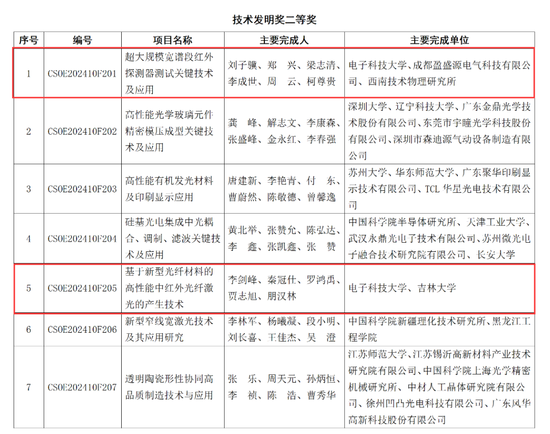 10月21日,中国光学工程学会发布了“第十届中国光学工程学会科学技术奖”,由光电学院与成都盈盛源电气科技有限公司、西南技术物理研究所联合申报的“超大规模宽谱段红外探测器测试关键技术及应用”、与吉林大学联合申报的“基于新型光纤材料的高性能中红外光纤激光的产生技术”两个项目均荣获“第十届中国光学工程学会科学技术奖”技术发明奖二等奖。我校为第一完成单位,刘子骥教授和李剑峰教授均为第一完成人。