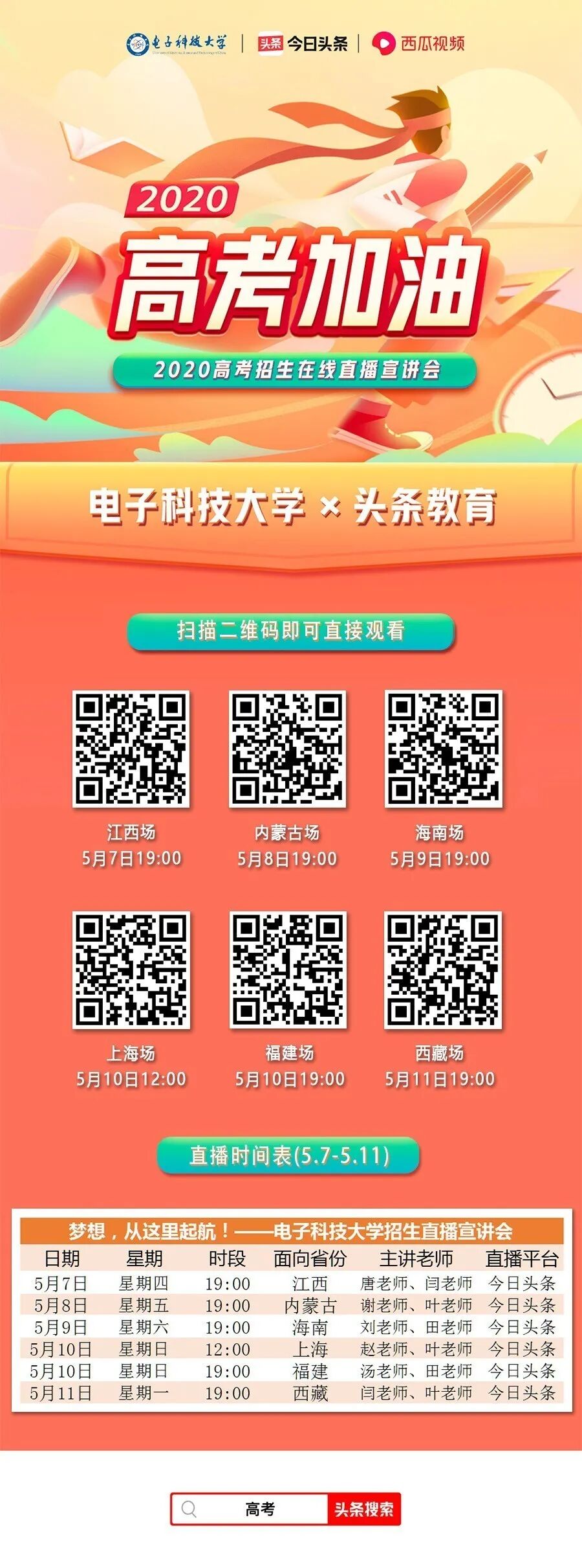 为了方便考生了解院校信息和招生政策,舒缓紧张的考前心理,电子科大本科招生办公室将通过今日头条平台开展线上宣讲活动,为各位考生答疑解惑。